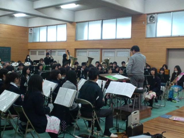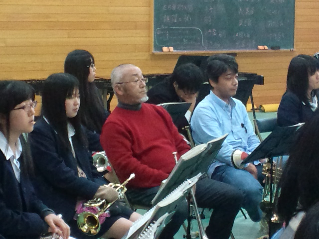 冷たい雨で中津高校、校門の桜も散り始めてました。 今日は中津高校定期演奏会の合同練習 グレンミラーメドレーとエルザの大聖堂への行列 現役生徒さんの練習の成果が発揮され、中々良い感じに仕上がってます。グレンミラーはOBの長老がさすがに味の有るソロを奏でてました。今日の練習風景です。 OBメンバーは合同練習後、OB総会に向けて役員会を開きました。